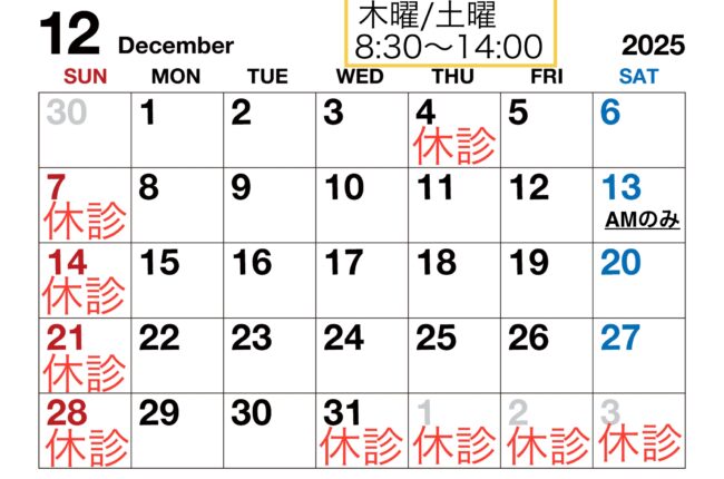 📢12月の診療のお知らせ📢・4日(木)・・休診・13日(土)・・午前のみ診療とさせて頂きます。※8月より木曜日の診療時間が8:30〜14:00に変更になっております。ご迷惑をおかけしますが