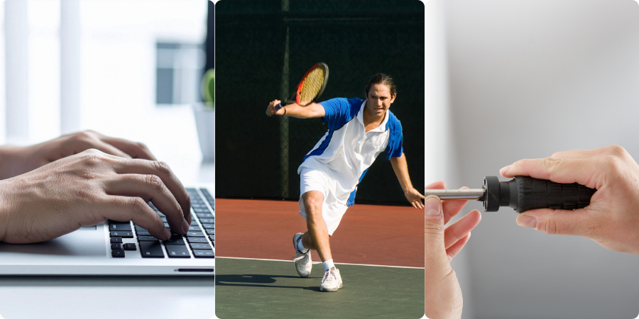 テニスなどのラケット競技の経験がある方はもちろん、スポーツ経験がない方でも家事や仕事での繰り返し手を使う動作で起こることが多く、放置したままだとなかなか改善しにくい厄介な症状の一つです。